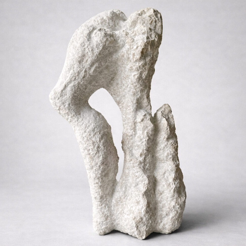 Cette sculpture évoque la mémoire minérale du temps. Taillée comme un fragment arraché à la terre, elle semble porter les traces d’une érosion lente, façonnée par les éléments et le silence. Les creux et les pleins dialoguent, suggérant un passage, une arche naturelle, ou la persistance d’un relief ancien. Entre force et fragilité, Vestige d’un paysage invite à contempler ce qui demeure lorsque tout s’efface : la trace, la matière, la respiration de la pierre.
